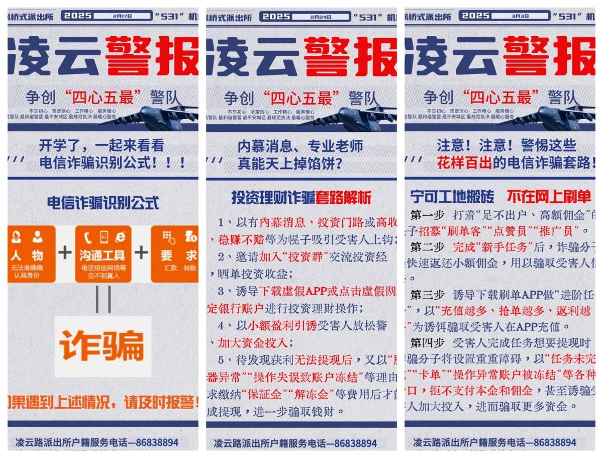 “通过定期发布反诈宣传海报,将专业的反诈知识转化为通俗易懂的内容,降低群众的理解门槛,帮助群众识别新型诈骗手段。”凌云路派出所所长张彦龙说道。为此,凌云路派出所每周制作发布三期《凌云警报》,紧跟诈骗分子技术迭代,通过 "话术拆解 套路解析" 等可视化形式,剖析最新诈骗手法及典型案例,通过“西安阎良公安”公众号、朋友圈、社区微信群等渠道广泛宣传,在源头上防住发案。