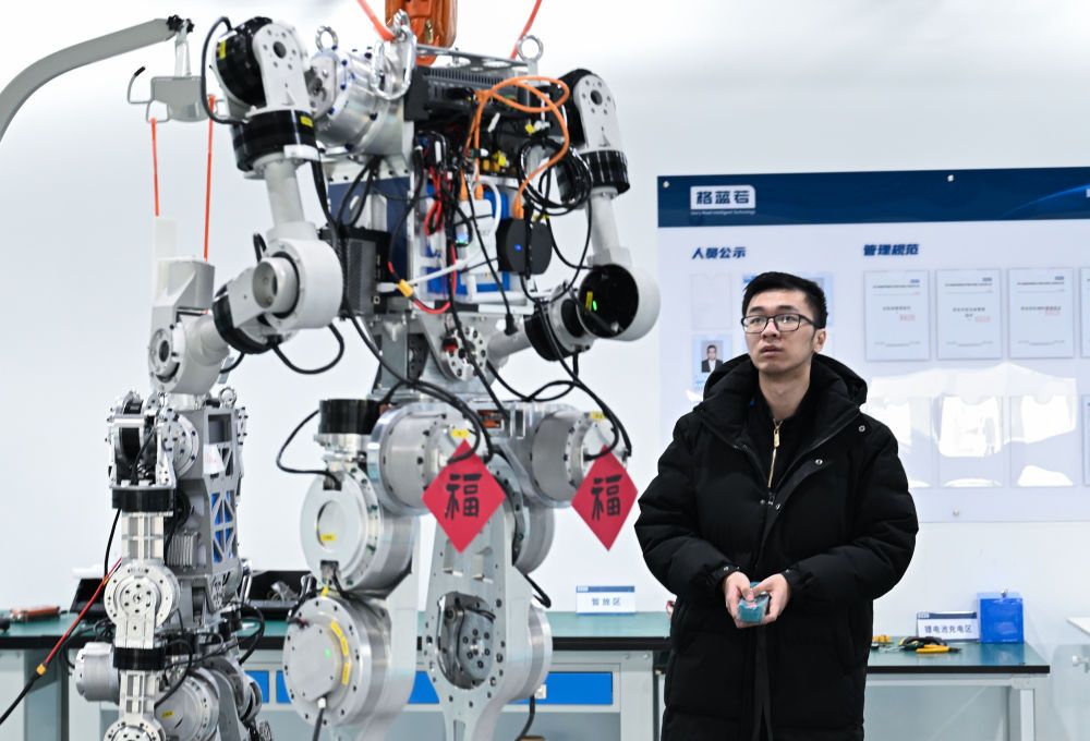2月24日,湖北武汉格蓝若智能技术股份有限公司员工在调试人形机器人。新华社记者杜子璇 摄