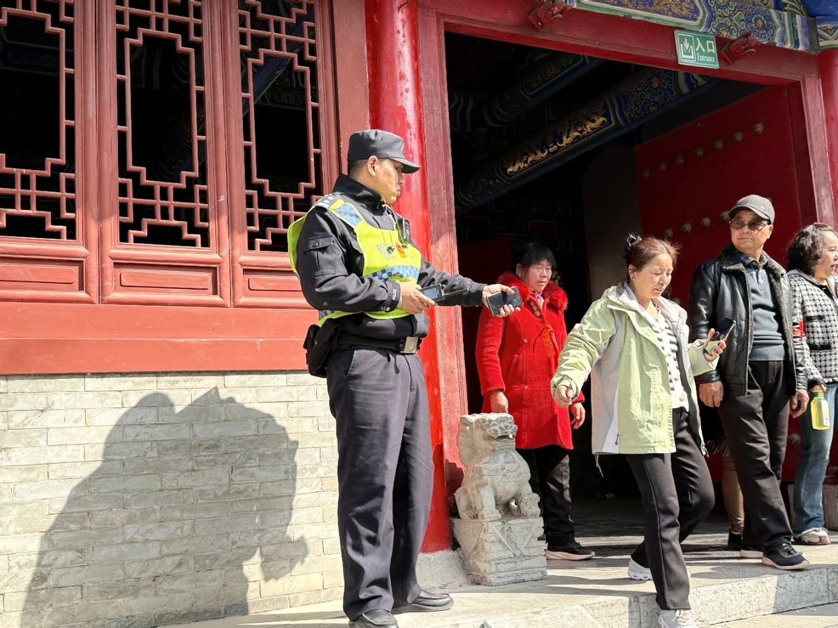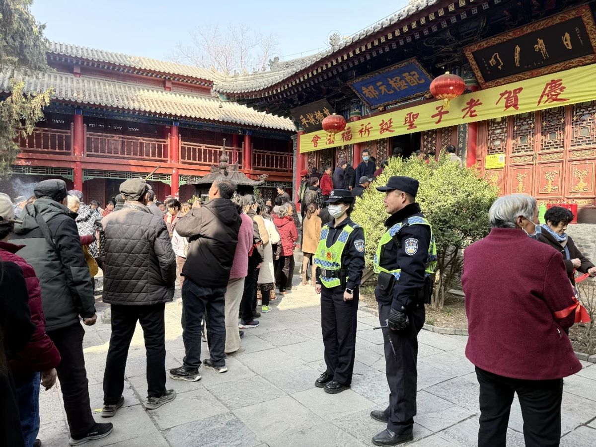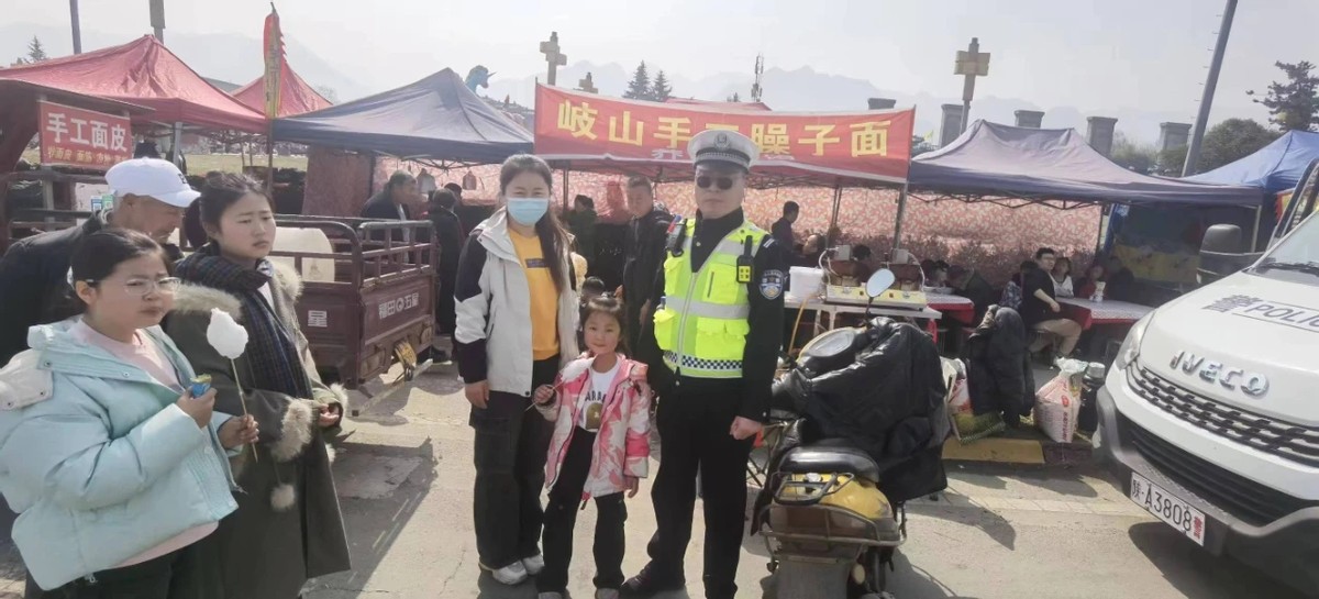 在各个执勤点位,民辅警充当旅游服务“活地图”,做到咨询服务“零距离”、安全提示“零懈怠”、救助服务“零误差”,全力确保庙会现场秩序井然。在仙都广场临时报警点,值守的楼观派出所民警接到群众求助,其6岁的女儿不慎走丢,民警立即发动周边警力,根据孩子样貌、特征全面进行排查,10余分钟后将孩子安全找回,受到家属的点赞认可。