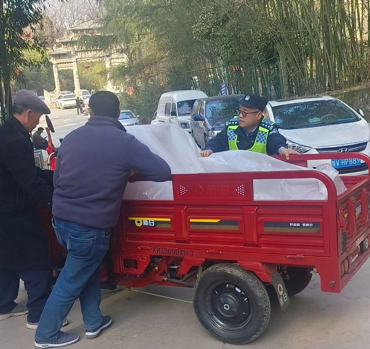 “登山台阶多,请大家注意脚下安全,切勿拥挤。”民警不断提醒游客注意安全,同时安排便衣警力在人员密集区域开展反扒工作,时刻守牢群众的财产安全。终南派出所执勤民警在虎豹沟管护站执勤点位发现一辆三轮车翻入路旁,所幸老人并无大碍,民警辅警立即上前,帮助老人将车辆拽至路边,叮嘱随行子女注意骑行环境,时刻注意安全。