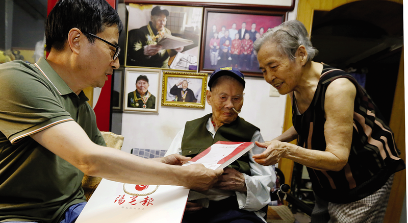 虽然言语已因年迈而含糊不清,行动更是离不开轮椅的支撑,但是当记者一行踏进家门时,老兵眼中瞬间迸发的光彩却异常明亮。他努力地抬起微微颤抖的手,指向心口的位置,又用力地指向胸口悬挂的那枚象征荣誉的勋章,浑浊的眼底竟泛起一丝清亮的水光。无需言语,那份属于军人的荣耀与对来访者的感激,已透过每一个细微的动作汹涌传递。随行的志愿者傅宏俯身轻轻握住他枯瘦的手,低语着:“黄爷爷,后辈都没忘记您,是您的奉献才有了我们幸福的今天!”老人嘴唇微动,握着志愿者的手,喉咙深处发出模糊的音节,脸上洋溢着幸福的笑容。