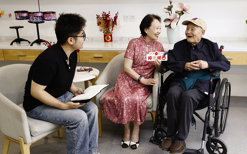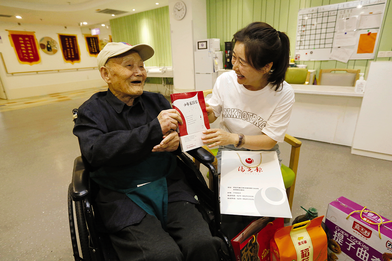 养老中心的工作人员带老兵赵思才欣赏金鱼。