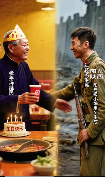 《阳光报》ai阳光工作室用ai技术使抗战老兵冯继民(已离世)“穿越”和年轻的自己同框。