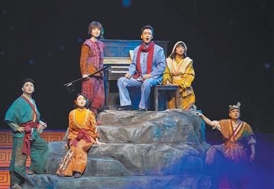 “大人们去打仗,就是为了让你们——可以有别的选择。”舞台上,冼星海对延安鲁迅艺术学院里学唱歌谣的小战士们坚定诉说。转眼,舞台背景,黄河滔滔,舞台上方,红旗飘飘,灯光将整个剧场染成一片金色。“保卫家乡!保卫黄河!保卫全中国!”延安歌舞剧团的演员们齐声高歌,台下观众激扬合唱。