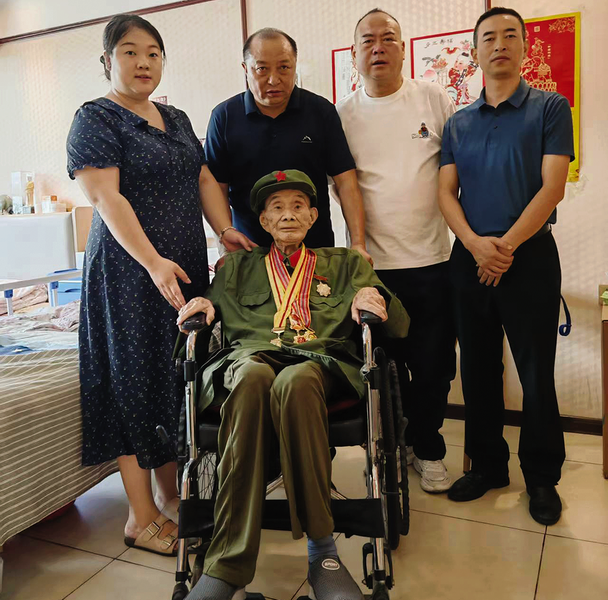 采访结束后,宁陕县人社民政局拥军优抚安置股尹敦峰(后排右一)、阳光报·阳光网记者潘定安(后排右二)等与百岁抗战老兵周观连合影留念。