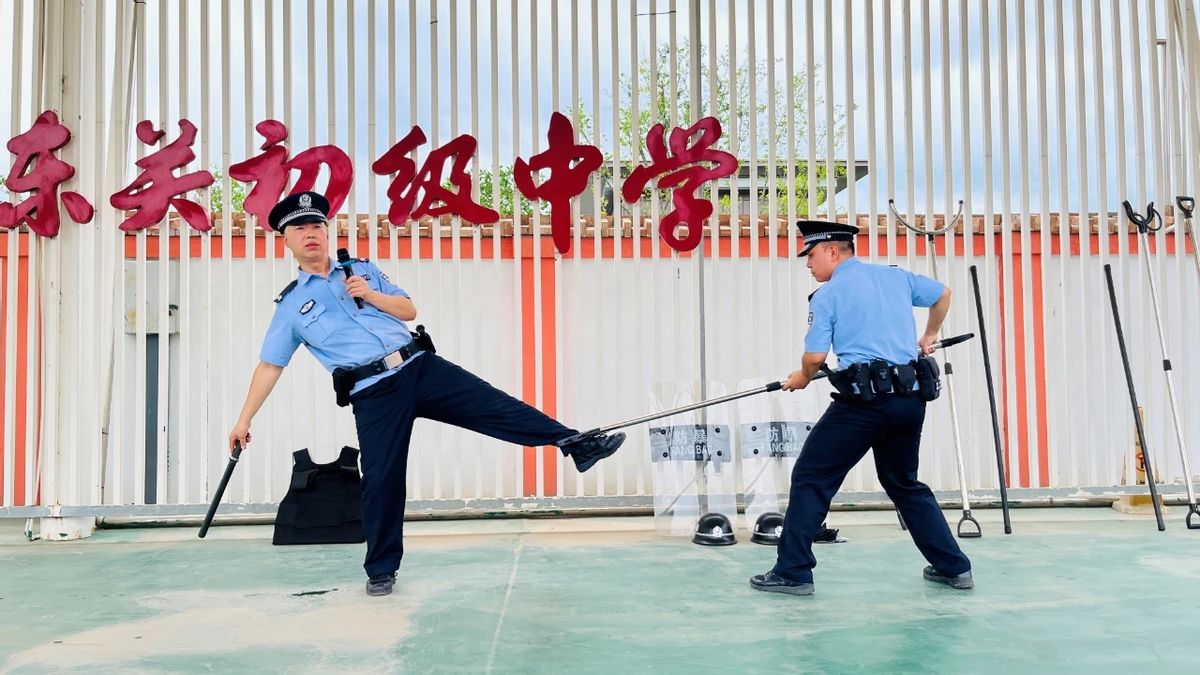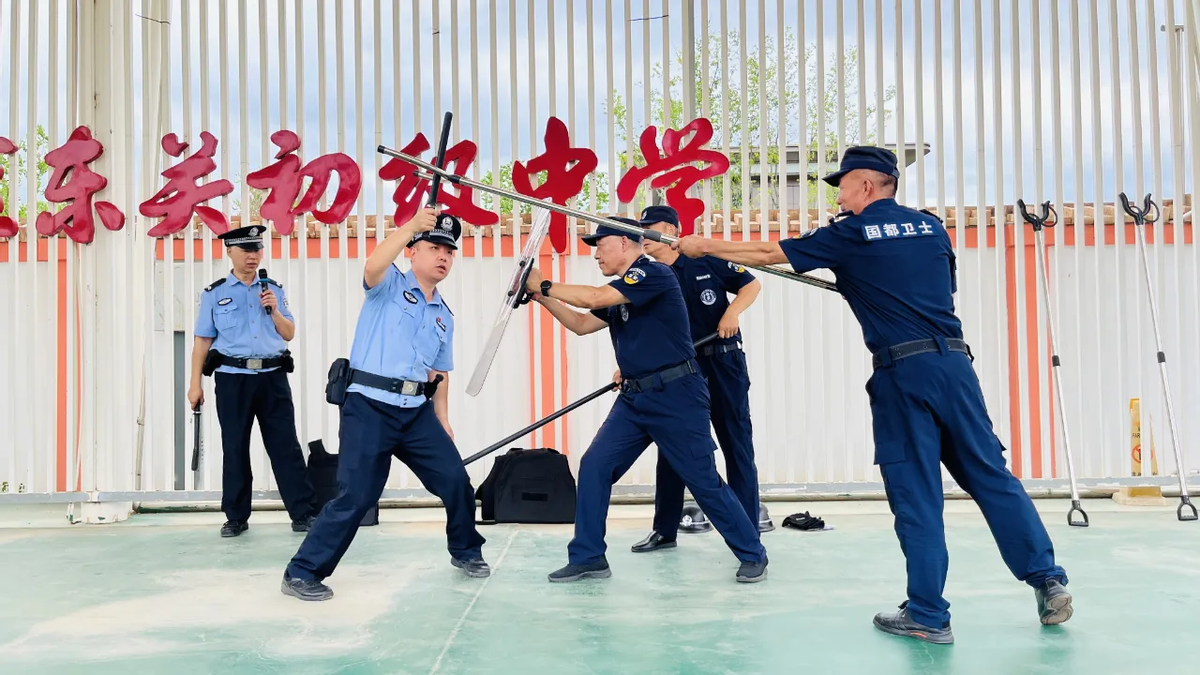 培训紧扣校园安保实际场景,以“实战实用”为导向,提升保安人员“懂处置、会操作、能协作”的应急能力作为核心目标。培训中,民警采取“分层教学、靶向指导”策略:理论讲解环节聚焦钢叉、盾牌、警棍等常用安保器械的“实战应用逻辑”,不仅拆解操作要领、规范使用流程,更结合人员冲撞、异常闯入等校园常见突发场景,讲解器械搭配技巧与安全注意事项,让保安“知其然更知其所以然”;技能训练环节通过“示范 纠错”方式,逐人规范动作、强化熟练度,同时明确着装标准与岗位职责,深化责任意识;实战演练环节则模拟“外来人员强行入校”等真实警情,组织保安分组协作,按照“快速响应、分工配合、有效控制”流程处置,针对“处置时机不准、器械操作不规范、团队配合不紧密”等问题当场纠正、逐一复盘,确保人人掌握突发情况先期处置要点。